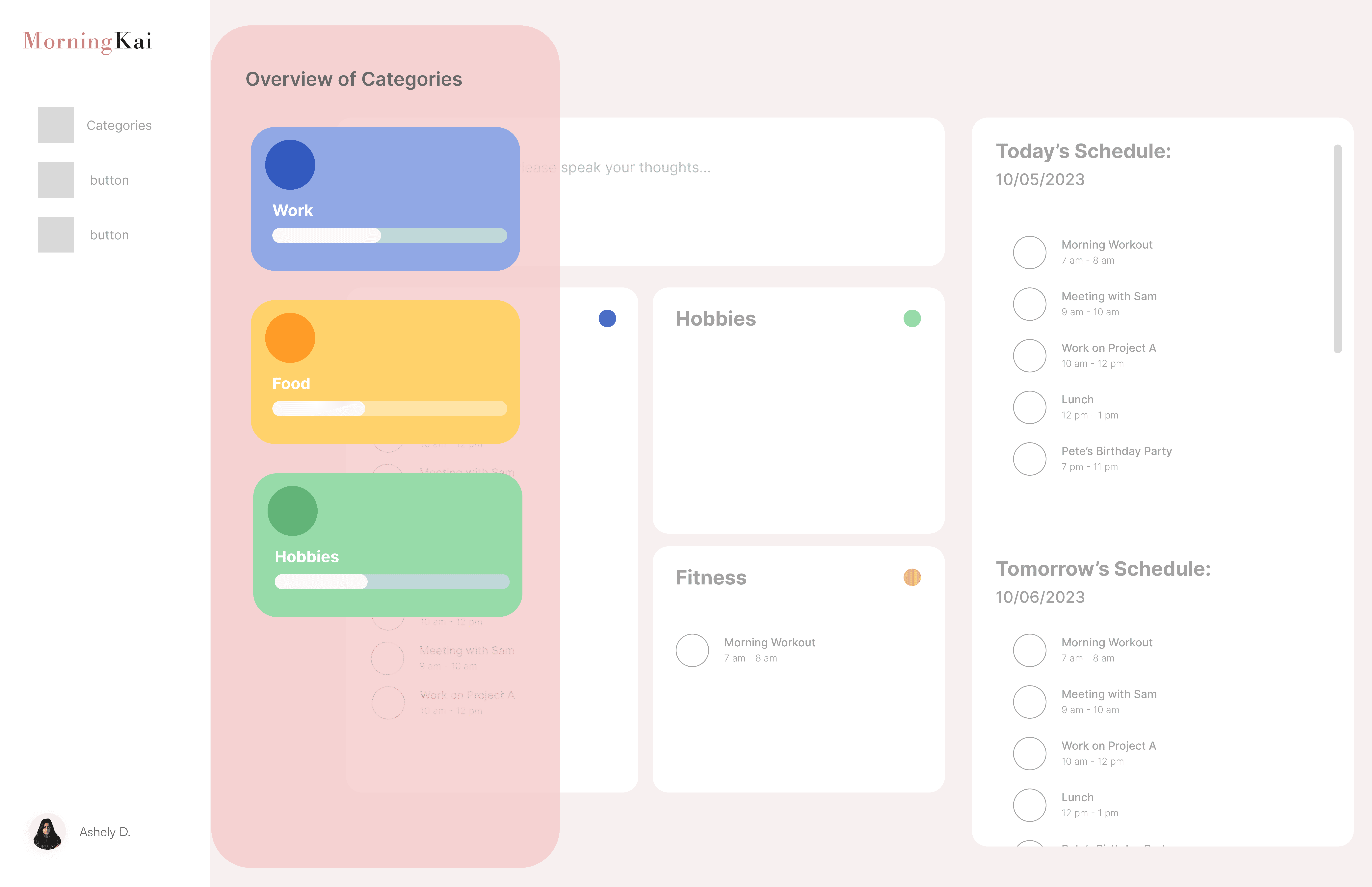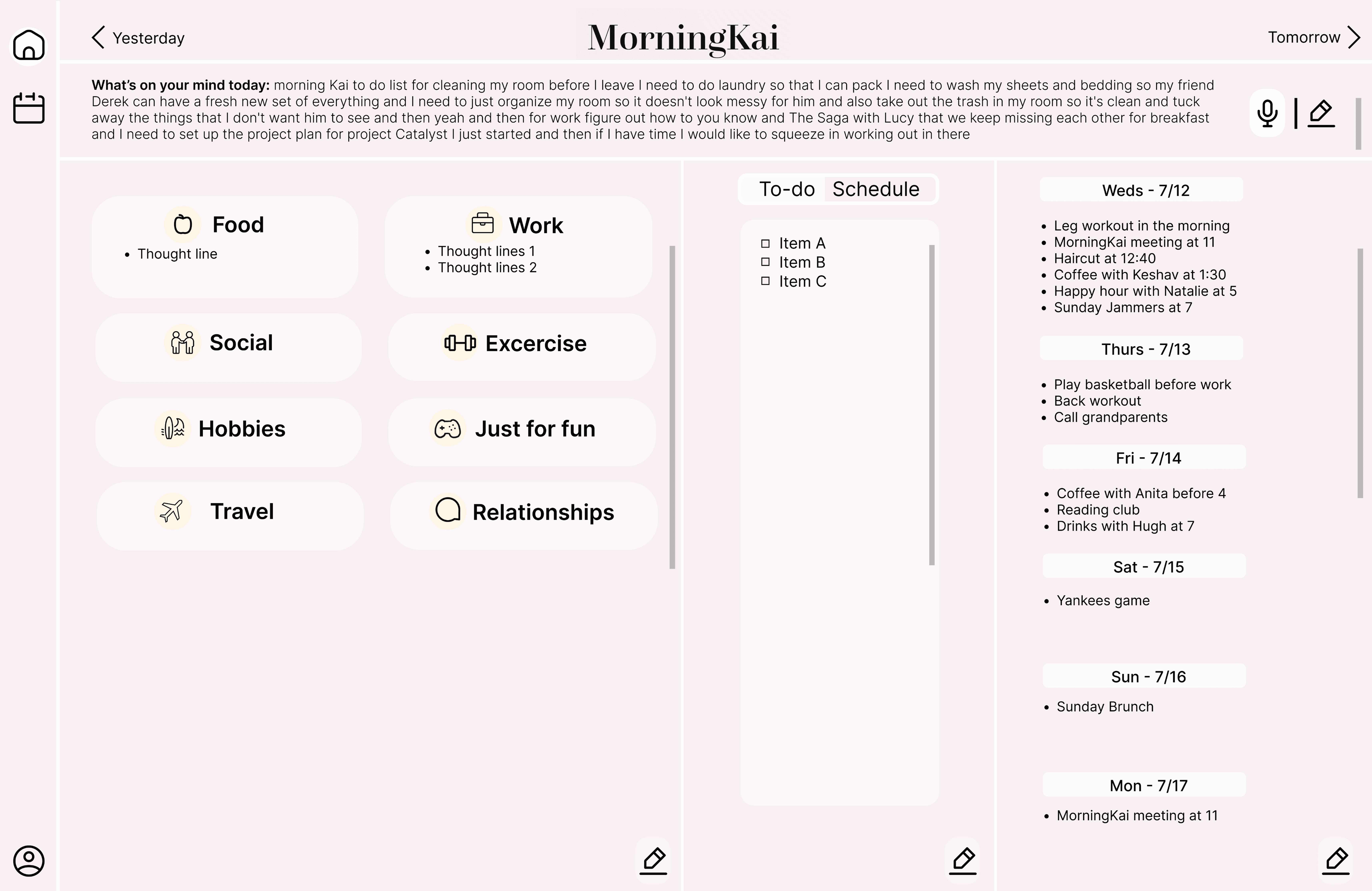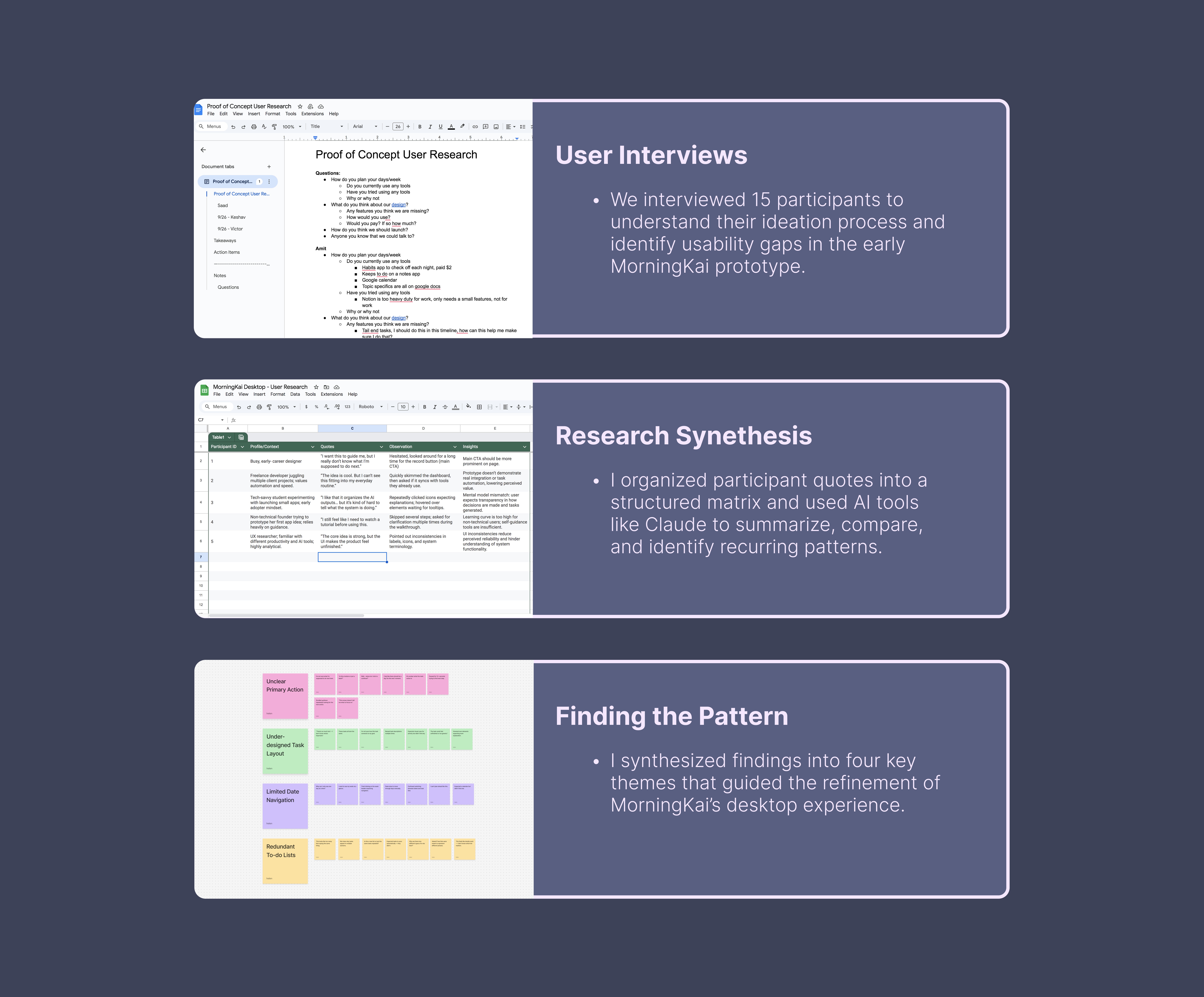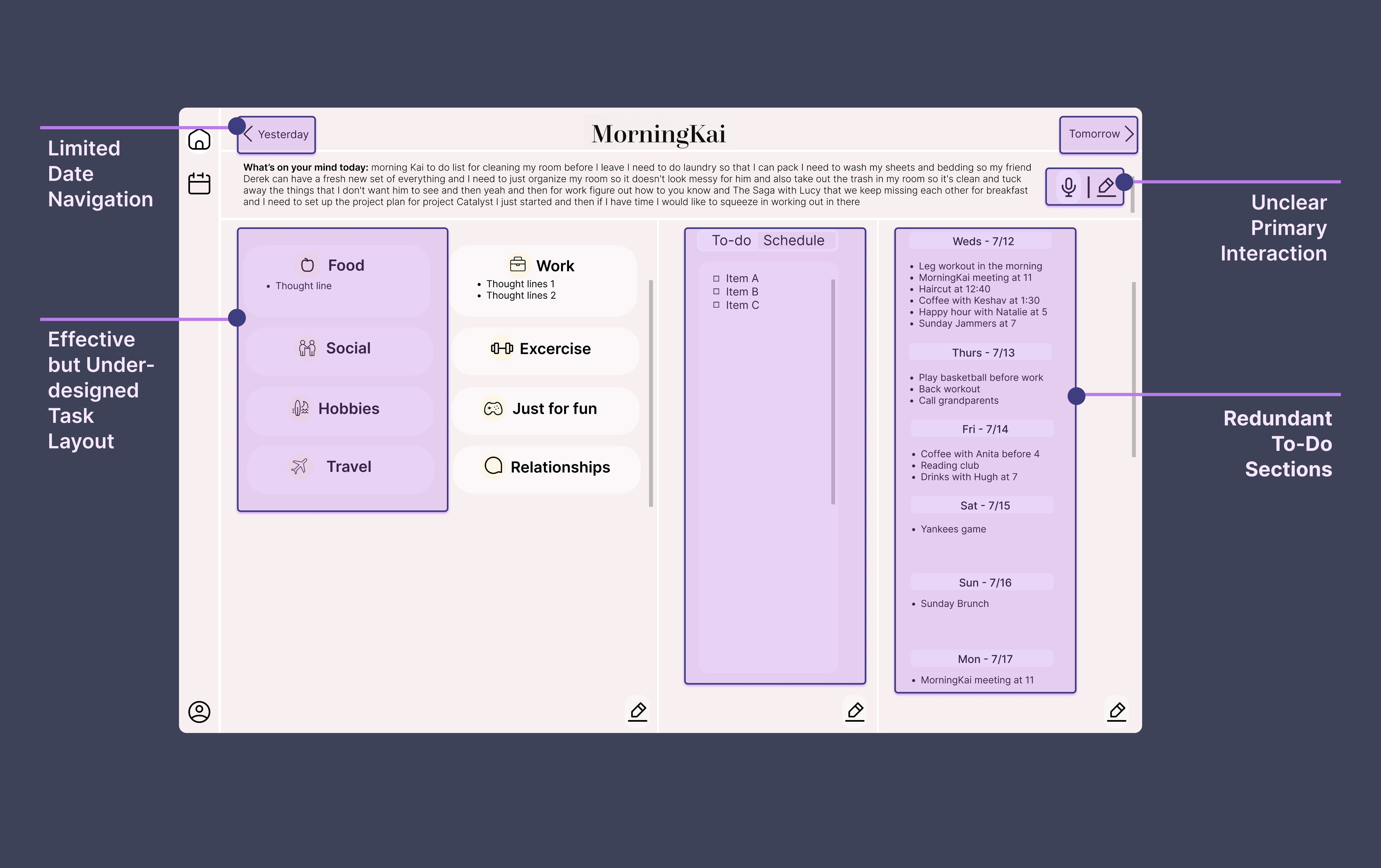 To validate the design priorities, I tested low- to mid-fidelity prototypes that explored different layouts for core features. Usability sessions revealed clear preference patterns and areas needing refinement. I moved forward with the first direction because centering the dashboard around categorized task buckets reinforced MorningKai’s core value: helping users visualize balance, recognize behavioral patterns, and actively reprioritize their schedules.