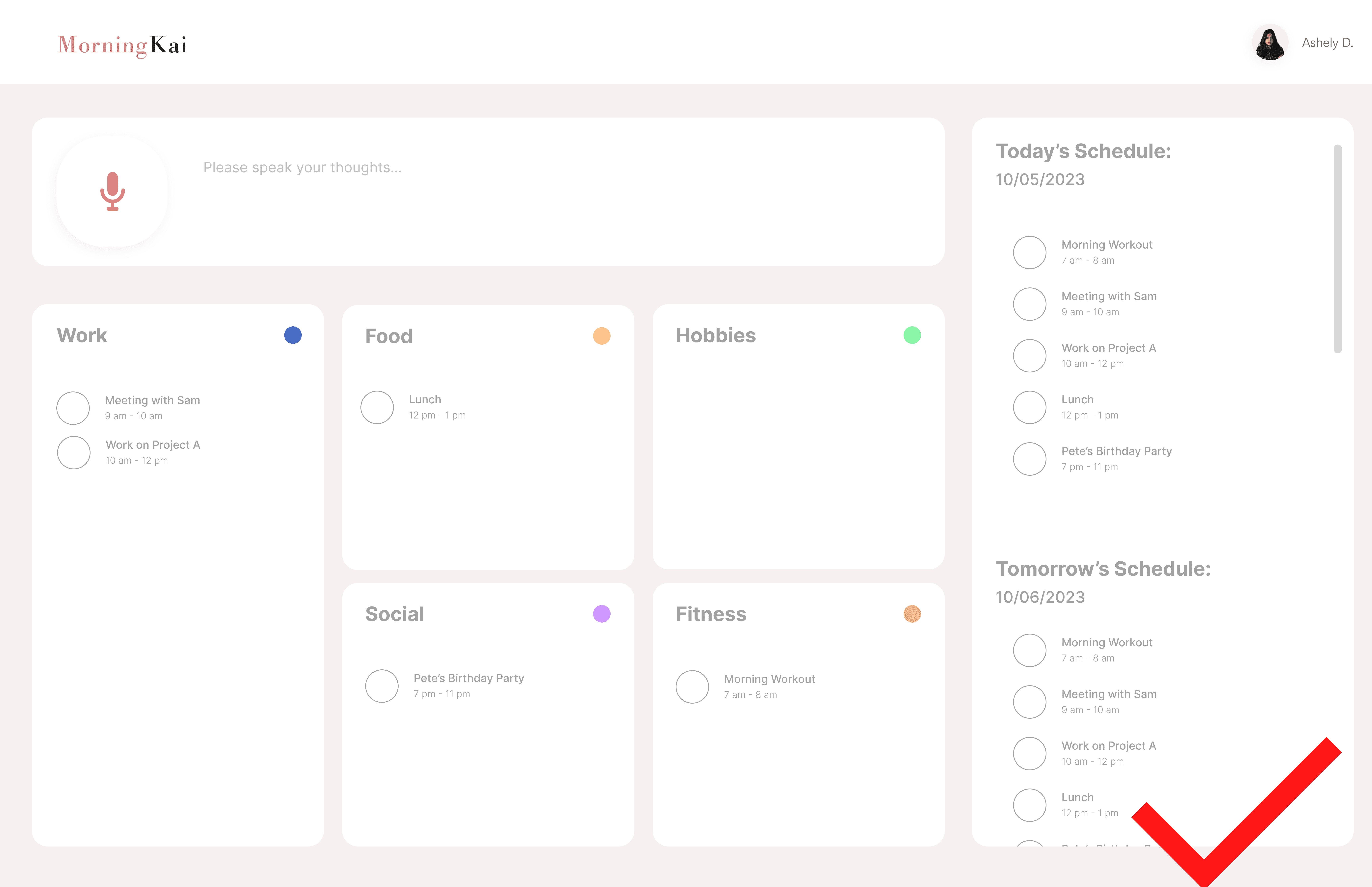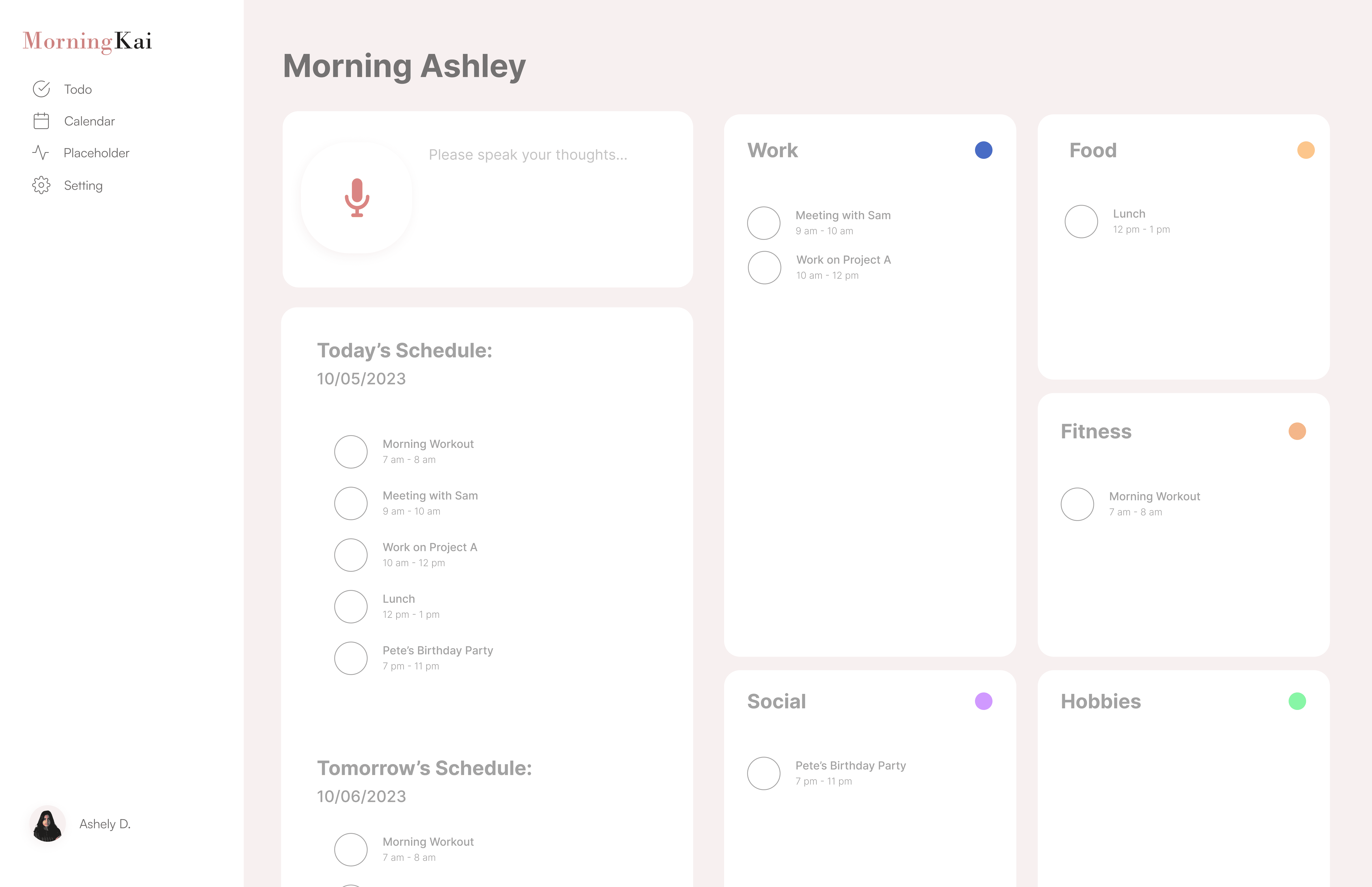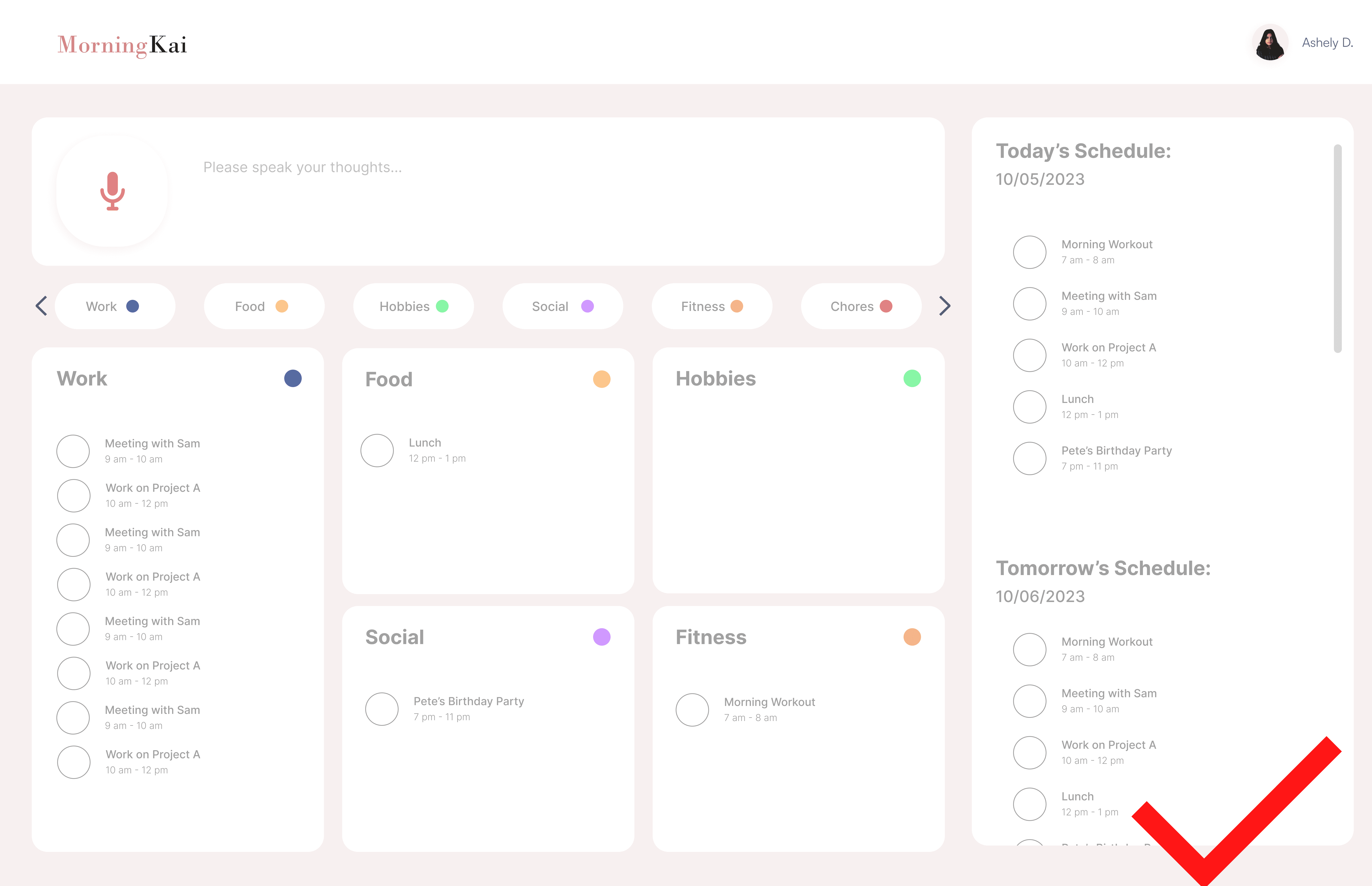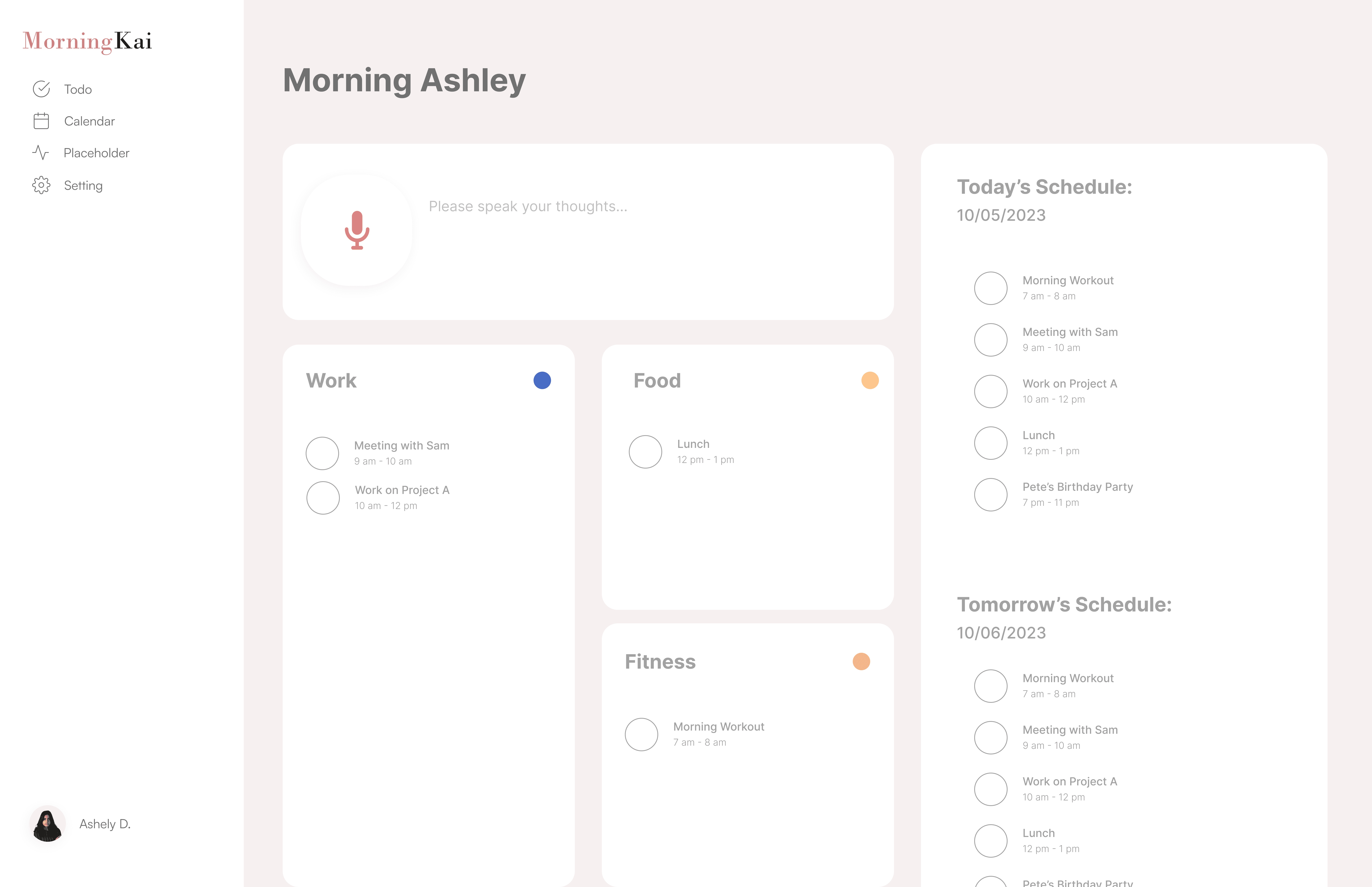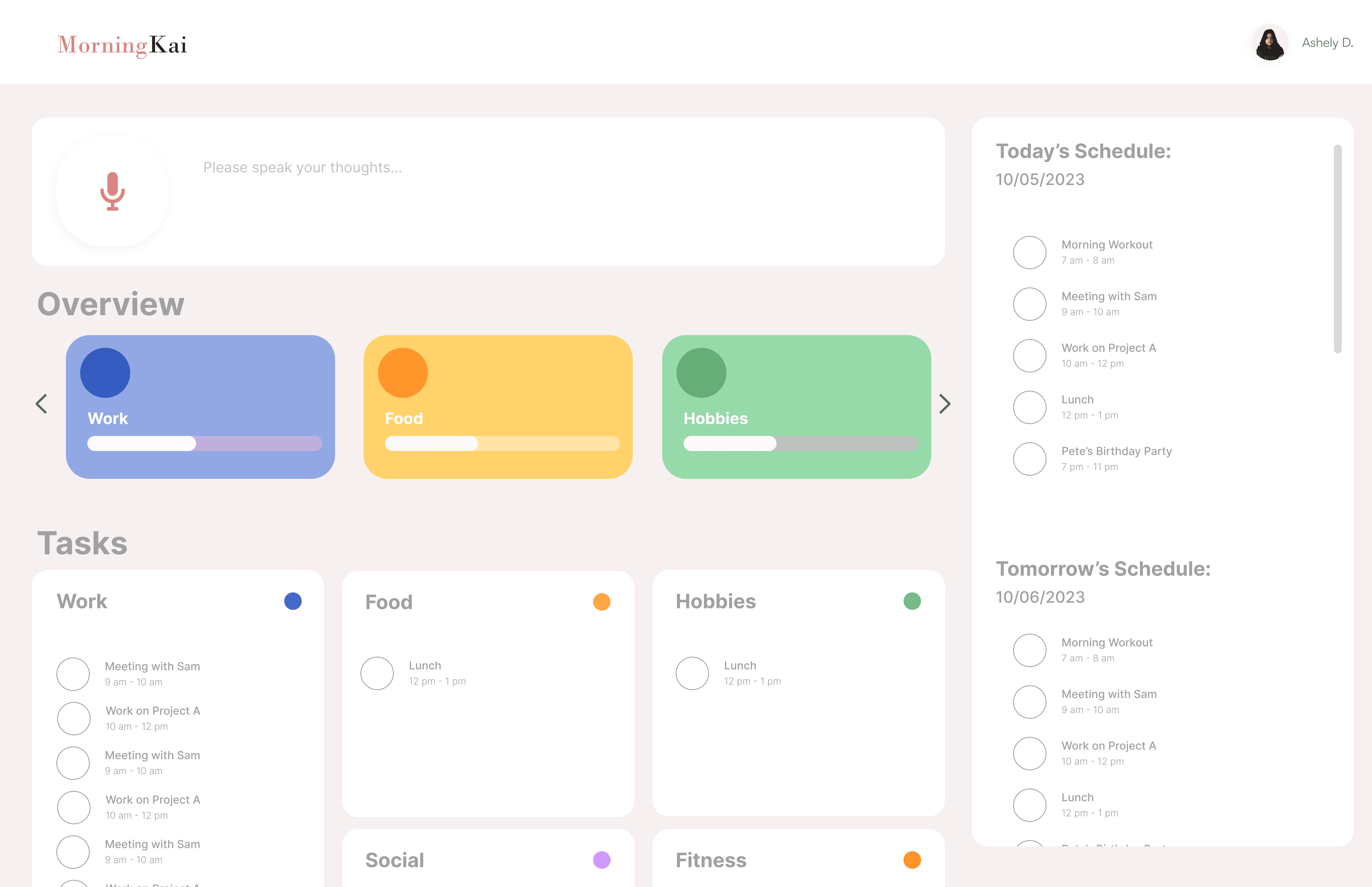 To validate the design priorities, I tested low- to mid-fidelity prototypes that explored different layouts for core features. Usability sessions revealed clear preference patterns and areas needing refinement. I moved forward with the first direction because centering the dashboard around categorized task buckets reinforced MorningKai’s core value: helping users visualize balance, recognize behavioral patterns, and actively reprioritize their schedules.