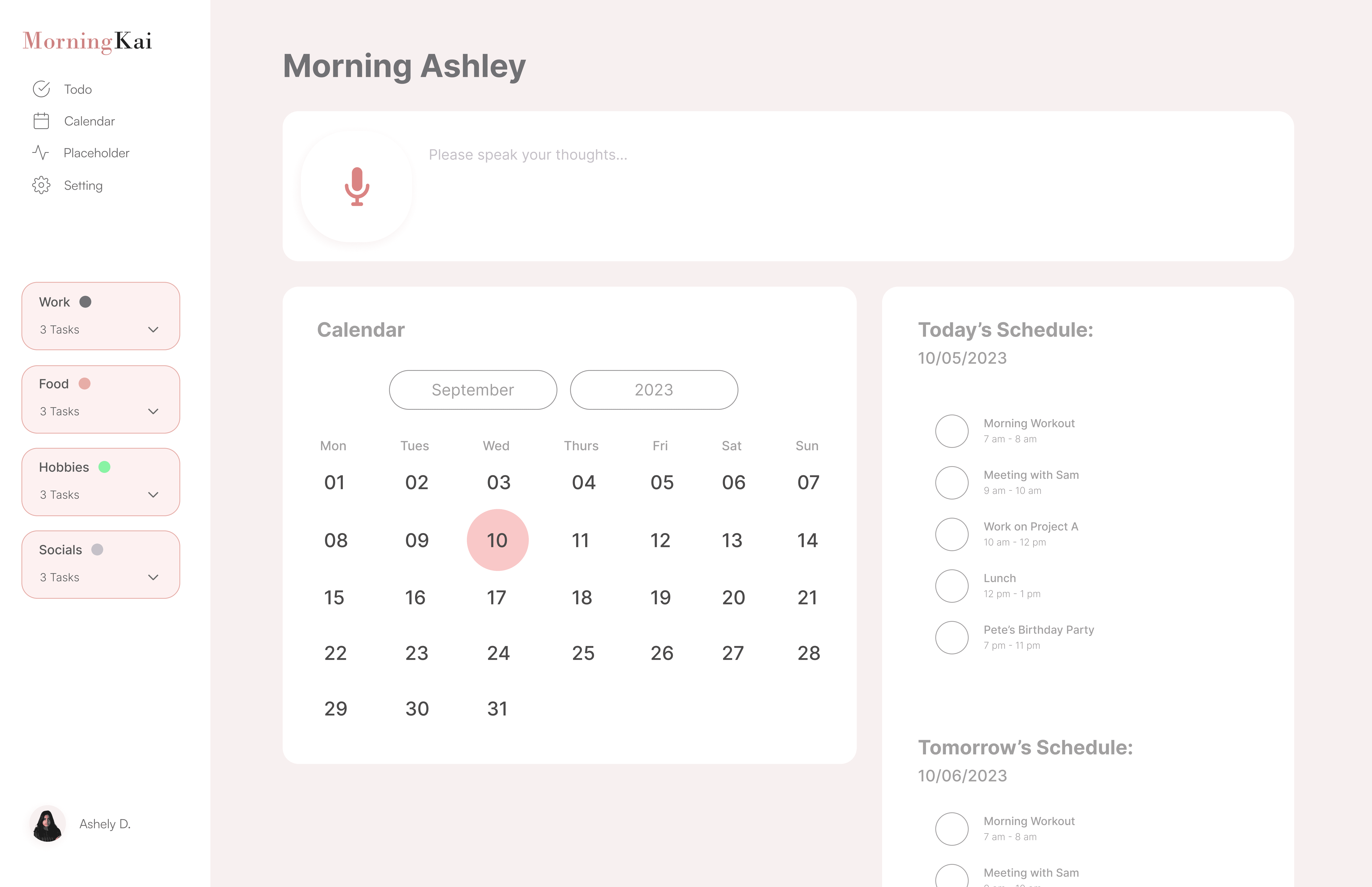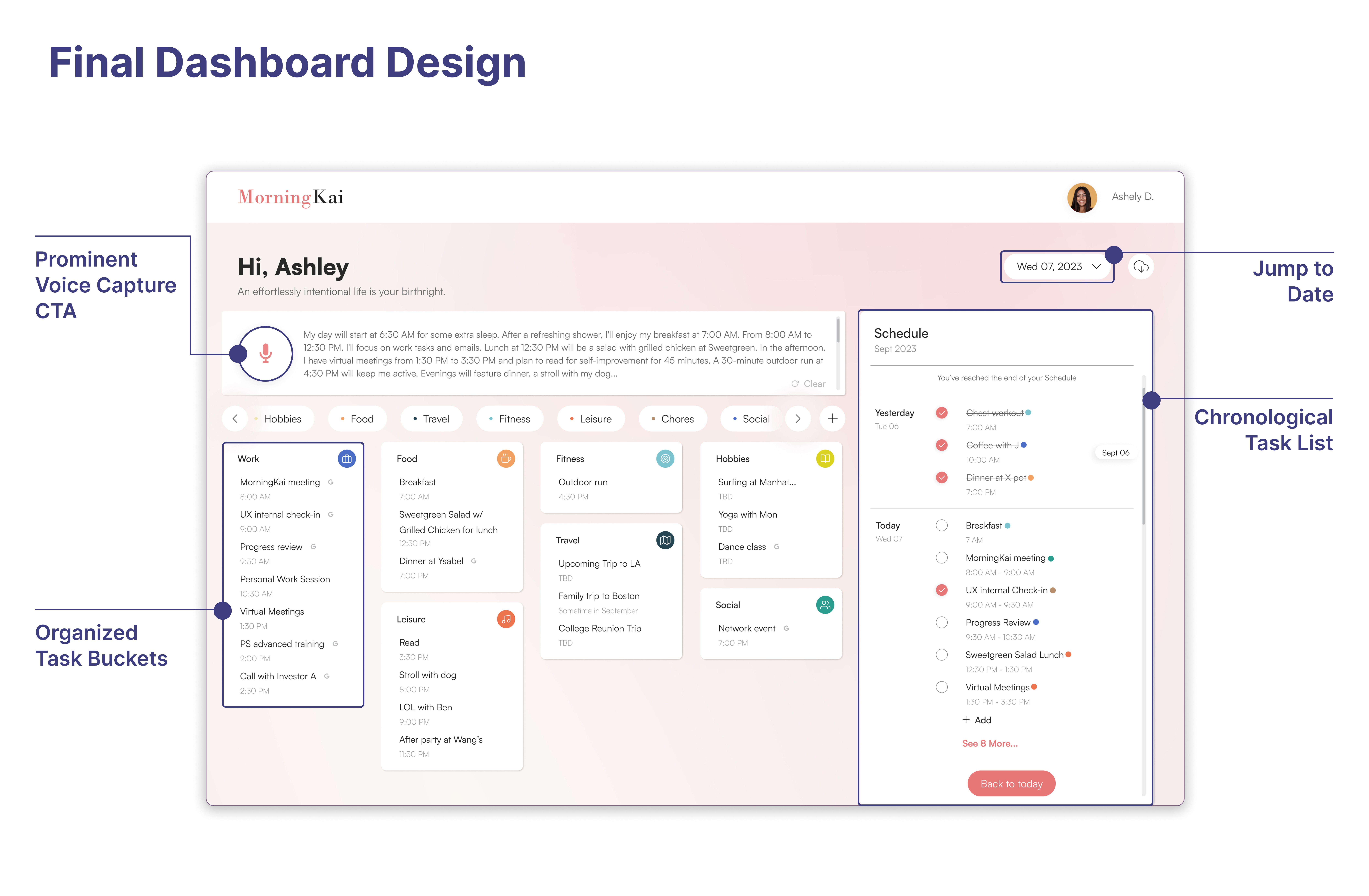 The final dashboard introduces a clear visual hierarchy that highlights key features and enables faster thought capture, easier task tracking, clearer activity patterns, and more intuitive date navigation.